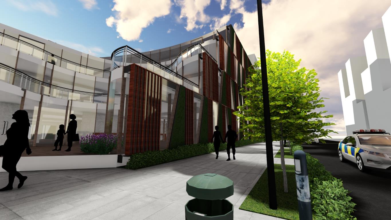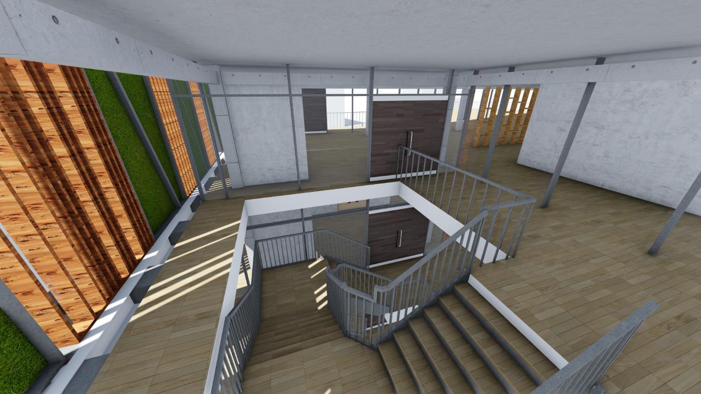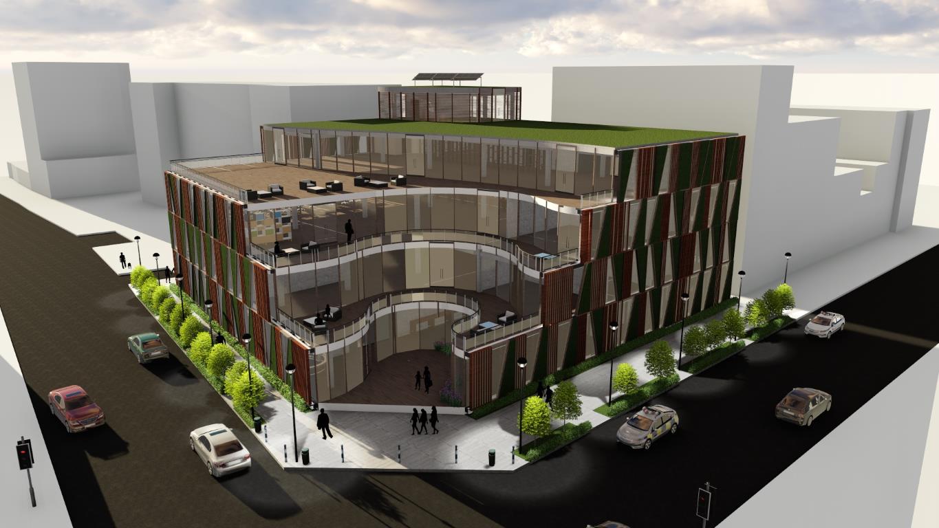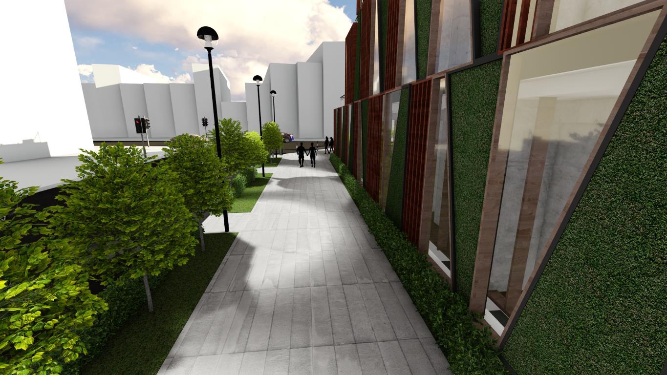 The outer leaf of the double façade is comprised of 3 main components which are the red cedar timber louvers, pilkington low e insulight glass and a green wall. the green wall has 3 main functions- to filtrate the highly concentrated co2 levels of the outside air into the building, to help act as a shading element and to act as an aesthetic element to the façade. the green wall is a modular system with built in meshwork to enable continous plant support for climbing plants to create a live curtain.the felt layers continous plant support for climbing plants to create a live curtain.the felt layers within the structure contain growth mediums as do the plant pots themselves. automatic irrigation systems are also installed into the top of the green walls to ensure the green walls are healthy. by adding the irrigation systems, the air surrounding the building will be cooled by the water and so will allow cooler air to enter the building via the double façade.